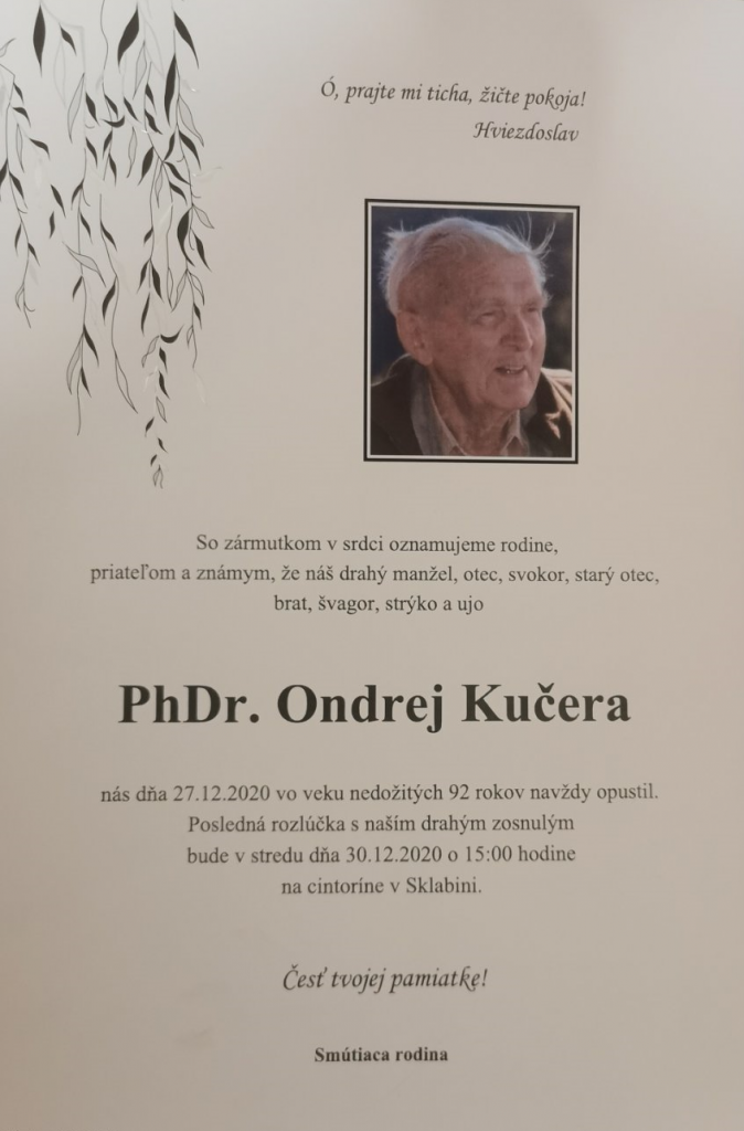 Obecný úrad so smútkom oznamuje, že dnes sme sa naposledy rozlúčili s našim čestným občanom a jedným z posledných priamych účastníkov SNP PhDr. Ondrejom Kučerom.