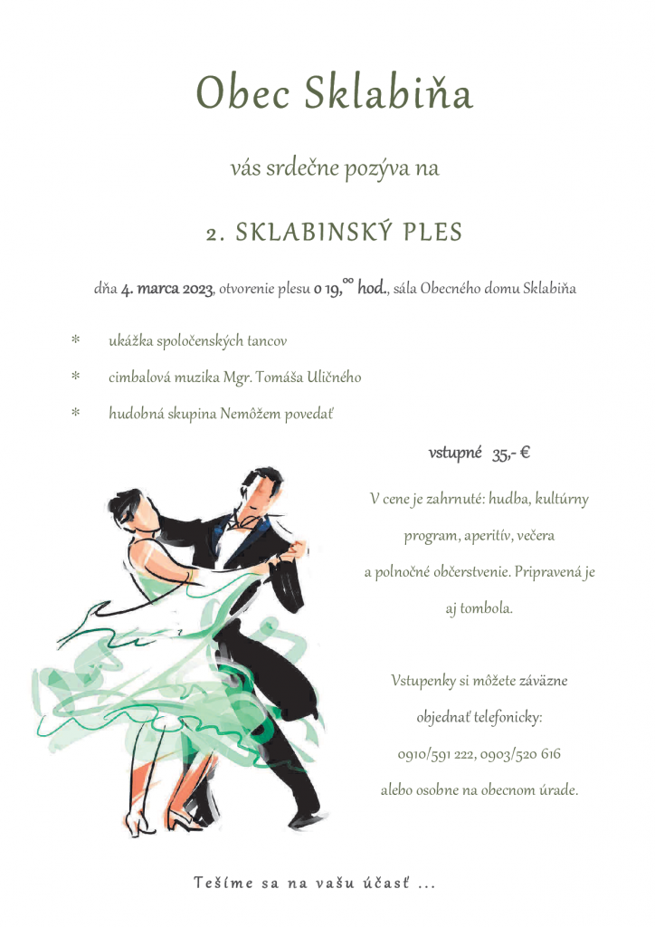 Obec Sklabiňa všetkých srdečne pozýva na 2. Sklabinský ples, ktorý sa uskutoční 4. marca 2023 od 19:00 hod. v sále Obecného domu v Sklabini.