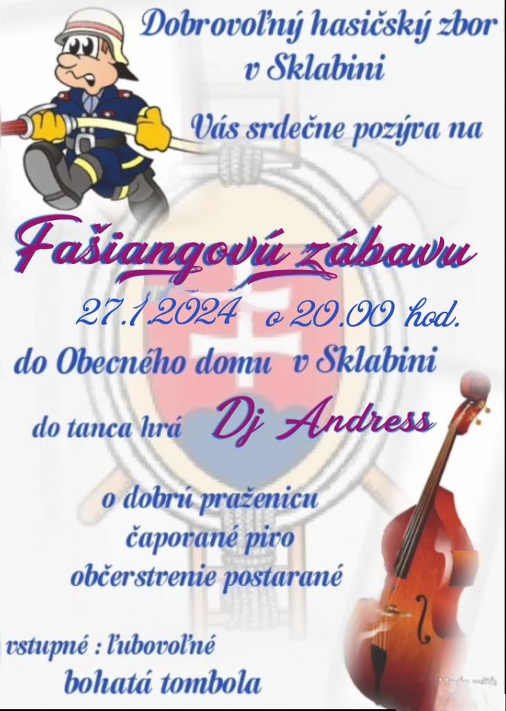 Dobrovoľný hasičský zbor v Sklabini pozýva všetkých občanov na Fašiangovú zábavu, ktorá sa uskutoční v sobotu 27.01.2024 od 20:00 hod. v kultúrnej sále obecného domu.