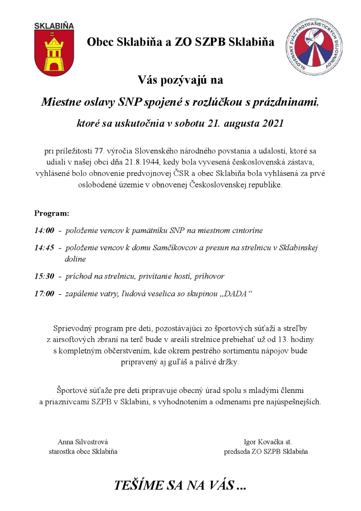Obec Sklabiňa a ZO SZPB Sklabiňa pozývajú všetkých občanov na miestne oslavy 77. výročia SNP, ktoré sa uskutočnia 21.08.2021 na športovej strelnici v Sklabini.